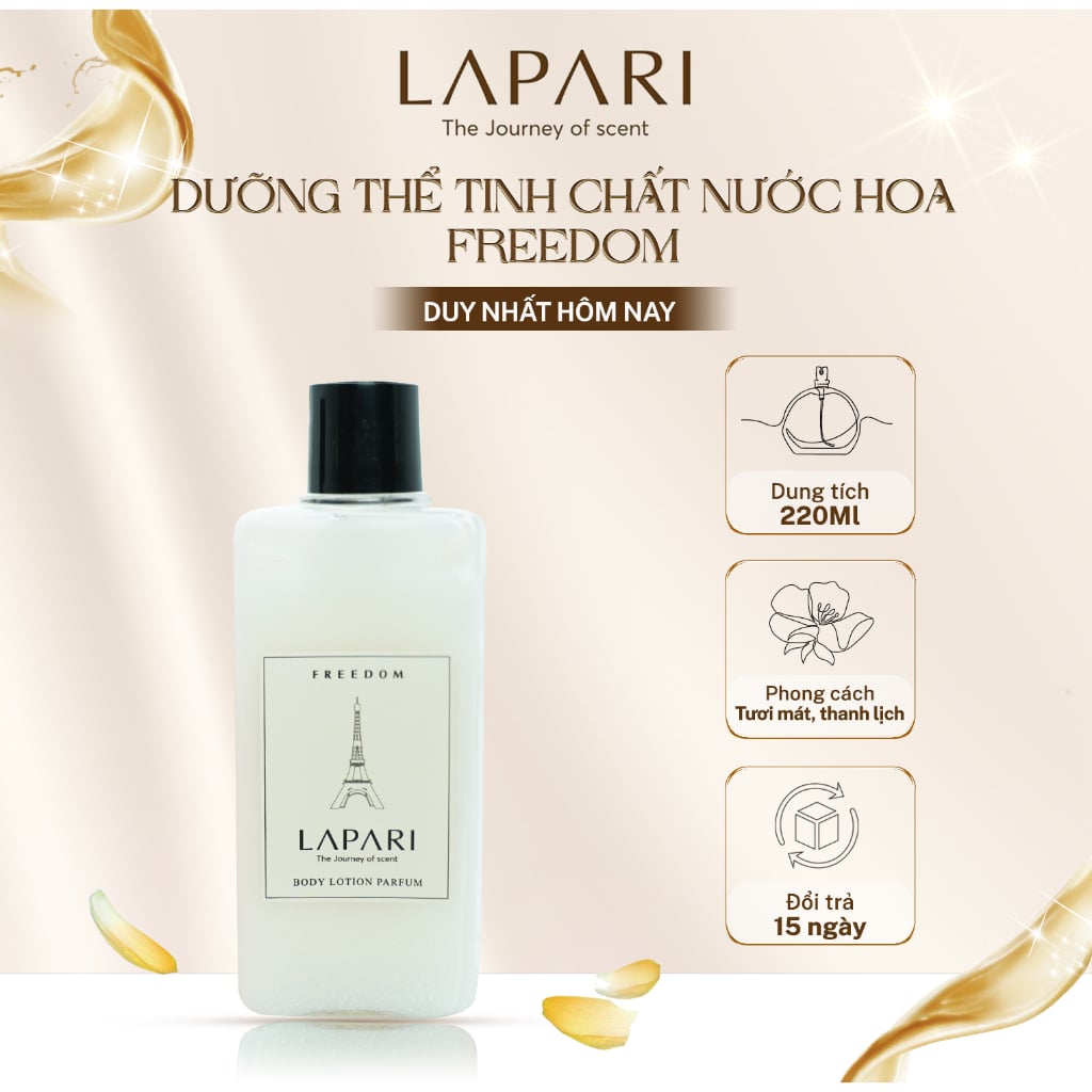 Dưỡng Thể Tinh Chất Nước Hoa FREEDOM 220ml là dòng sản phẩm cao cấp đến từ thương hiệu LAPARI. FREEDOM 220ml Body Lotion mang lại cho bạn làn da thơm tho, quyến rũ, mịn màng suốt 24 giờ.
